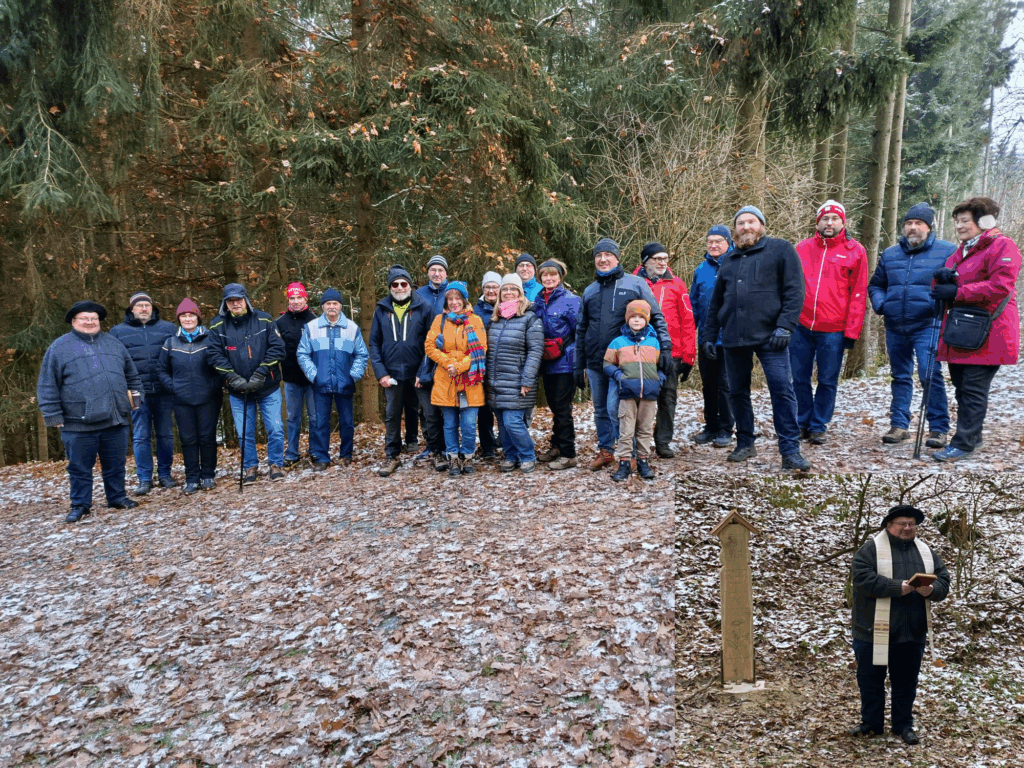 Bei winterlichen Temperaturen starteten rund zehn Wanderer ihre Tour, die zunächst über die Waldnaab führte. Anschließend ging es vorbei an Fischteichen hinauf zum Ortsteil Neuhaus, wo sich die Neuhauser Wandergruppe anschloss. Über leicht schneebedeckte Felder führte der Weg weiter zum Wald und entlang des Waldrandes schließlich zum Gedenkplatz am Johannisthalweg.